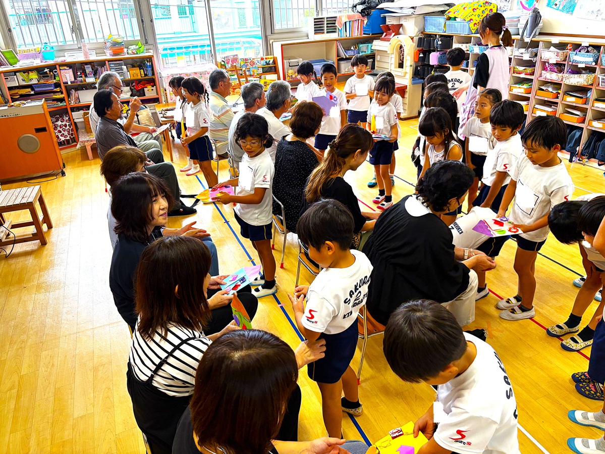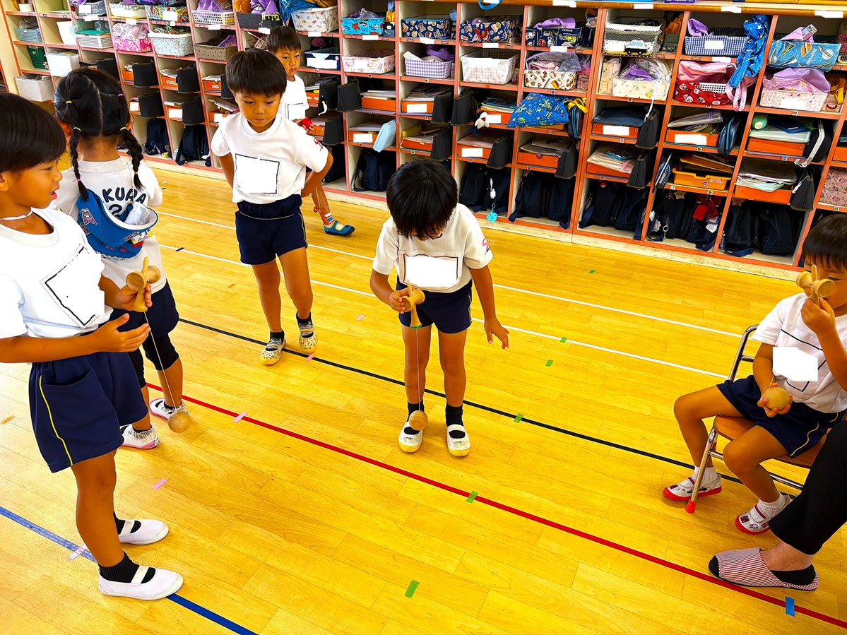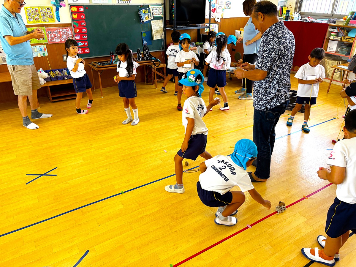 2025.09.29 お知らせ 伝承会 伝承会を行いました! 9月26日に伝承会が行われました。「伝承」とは、古くからあるしきたり・信仰・風習などを後世に伝えていく事を意味します。当日は、年長さんの祖父母の方々にお越し頂き、様々な遊びを教えてもらいました(^^)コマ・けんだま・紙相撲・おはじき・おてだま・ゴム跳び・竹とんぼ・竹馬など、子ども達もたくさんの遊びを夢中になって楽しんでいました! ~伝承会の様子~