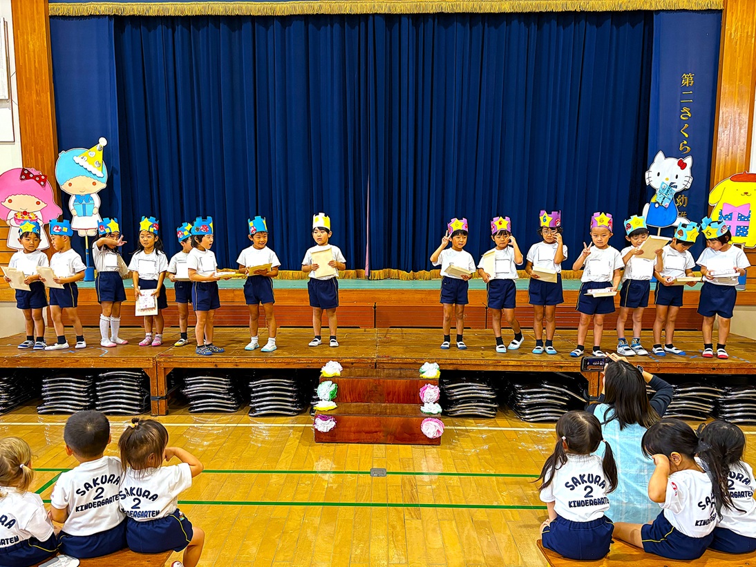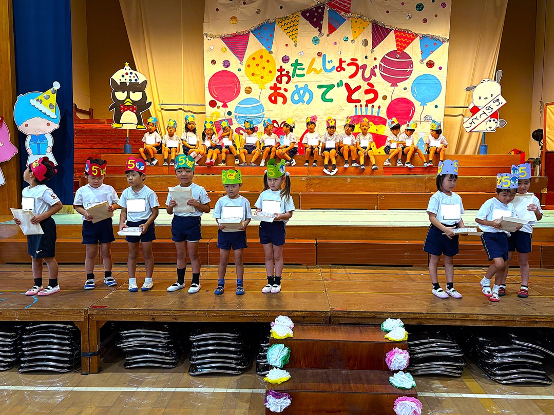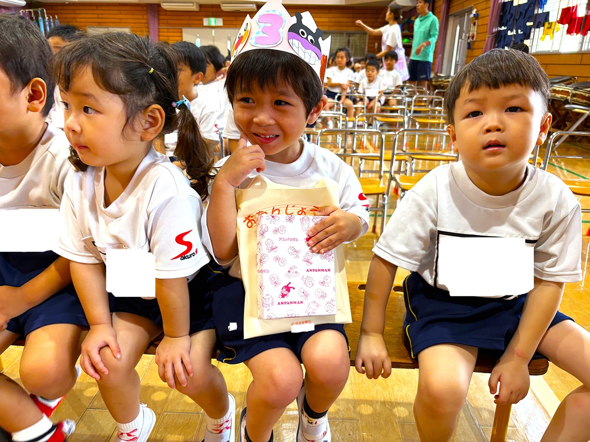 2025.10.06 お知らせ 10月誕生会 お誕生日おめでとう!! 10月3日に10月生まれのお友だちの誕生会を行いました。お友だちからの歌や、プレゼントを貰って喜ぶ可愛い笑顔が見られ、先生たちからの出し物もあり、楽しい誕生会になりました(^^♪10月生まれのお友だち、誕生日おめでとう!! ~誕生会の様子~