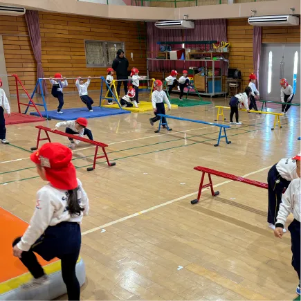 体育指導者と一緒に体育指導を行っています。とび箱、鉄棒、マットなどを使った器械運動、ボールや縄跳びなどを使った手具運動。