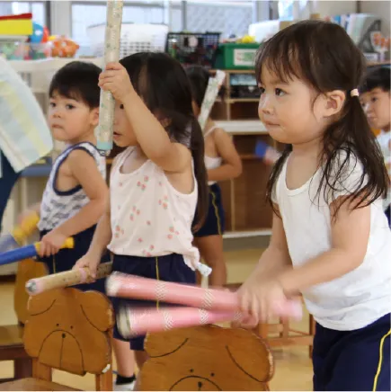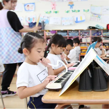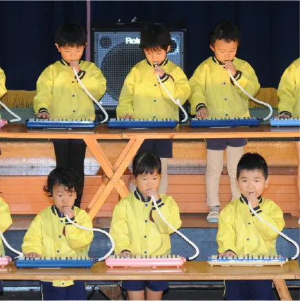 音楽教育にも力を入れており、歌、メロディオン、お遊戯などの他にも、色々な楽器に触れる機会を取り入れています。メロディオン、合奏、お遊戯は発表会で披露してくれます。