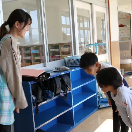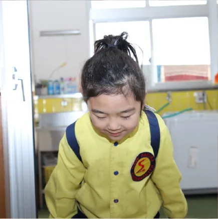 先生やお友達と、立ち止まり、目と目をあわせて挨拶をする。椅子に姿勢良く、落ち着いて座る。履物が揃えられる。しっかり返事が出来る。それが、当たり前にできるようになる教育を行っています。