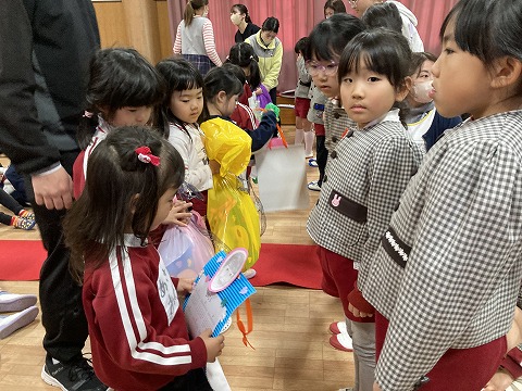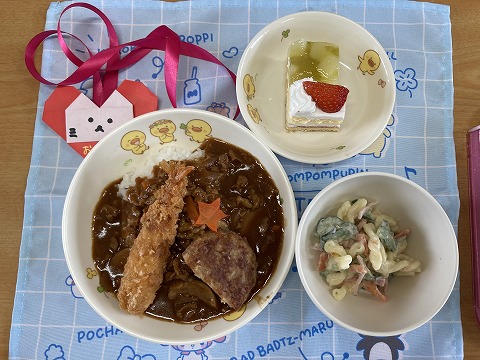 2025.03.13 さくらっこブログ お別れ会がありました 今日は来週卒園する年長さんとの「お別れ会」がありました🌸たくさん遊んでくれて、お世話もしてくれたお兄さん、お姉さんたちと楽しい時間を過ごすことが出来ましたね🤗 年長さんの給食はスペシャルメニュー🍛♥️給食の先生手作りの「おめでとうメダル」も付いていてとても嬉しかったですね! \小学校でも笑顔で過ごしてくださいね🎵/