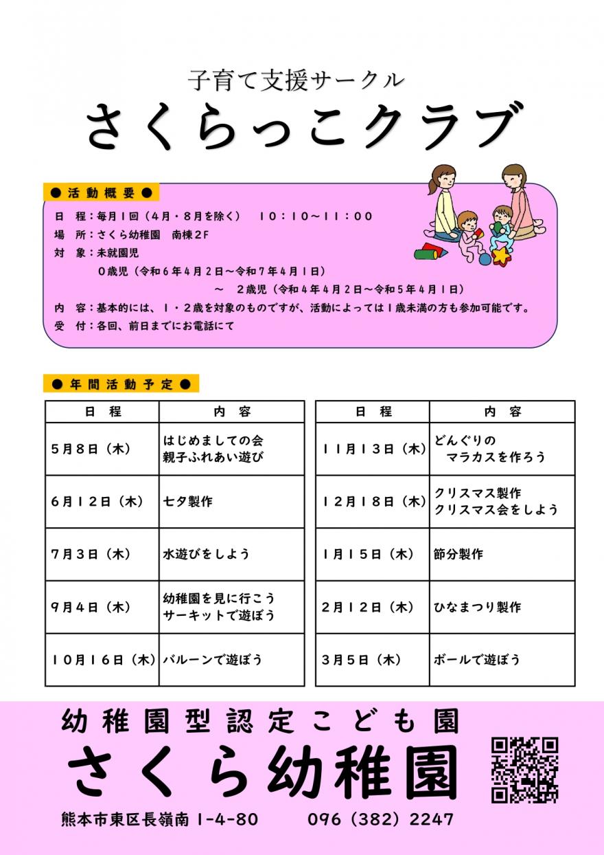 2025.04.10 お知らせ 令和7年度『さくらっこクラブ』活動スタート!!★0・1・2歳児対象★ 子育て支援サークル「さくらっこクラブ」の令和7年度活動が、5月からスタートします!親子で楽しい時間を一緒に過ごしませんか?対象、日程、主な活動内容などは添付の案内をご確認ください。みなさまのご参加、お待ちしてます♪