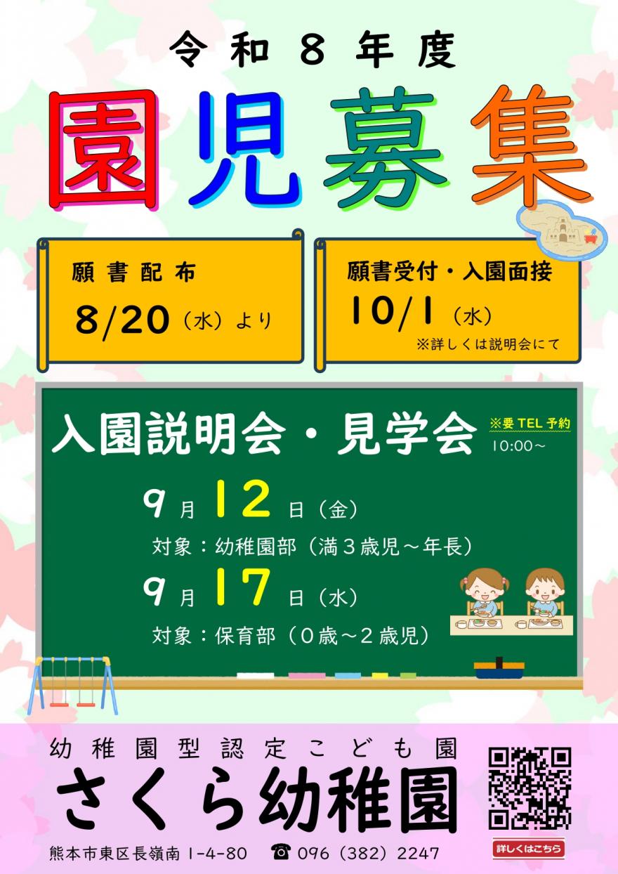 2025.08.01 お知らせ 令和8年度新入園児募集について 8月20日(水)より、幼稚園にて願書配布をスタートいたします。入園説明会を予定しておりますので、入園ご希望の方は、是非ご連絡ください。 募集定員などは下記ページをご参照ください。 「入園について」の情報ページ